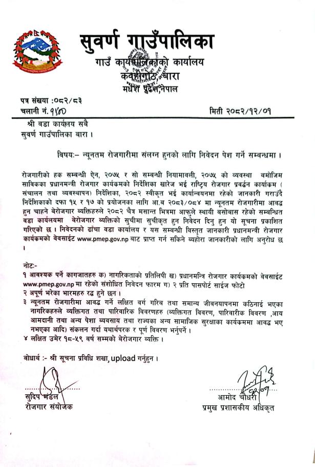 न्यूनतम रोजगारीमा संलग्न हुनको लागि निवेदन पेश गर्ने सम्बन्धमा ।