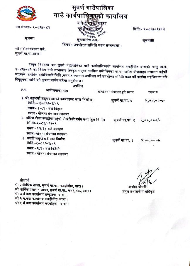 उपभोक्ता समिति गठन गर्ने सम्बन्धमा ।
