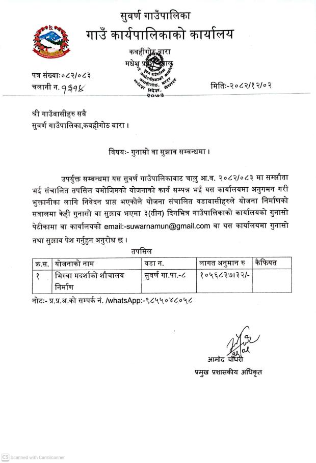 श्री गाउँबासीहरु सबै गुनासो वा सुझाव सम्बन्धमा ।