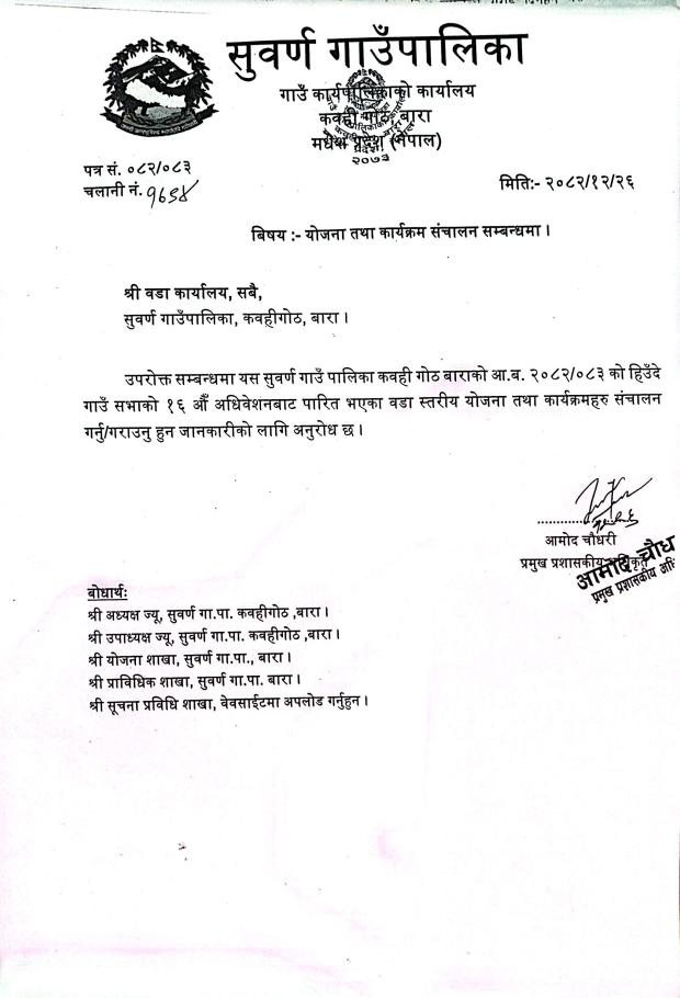 सुवर्ण गाउँपालिकाको कार्यालय कवहीगोठ बाराको गाउँ स|भाको १६औ अधिवेशन आज मिति २०८२।१२।२२ गते यस सुवर्ण गाउँपालिकाका अध्यक्ष श्री राजेश प्रसाद यादव ज्यूबाट उद्दघाटन भई निर्णयहरु पारित गरी सम्पन्न भएको केही झलकहरु ।