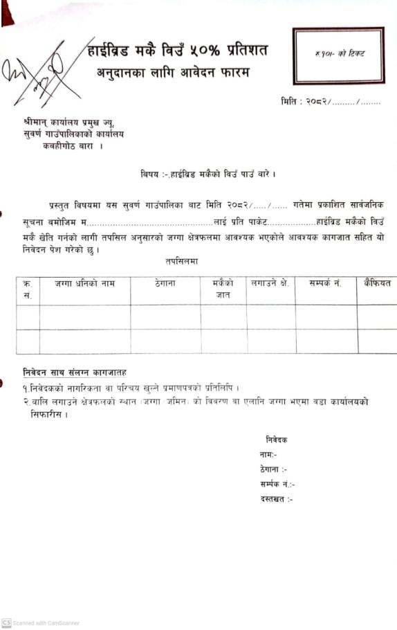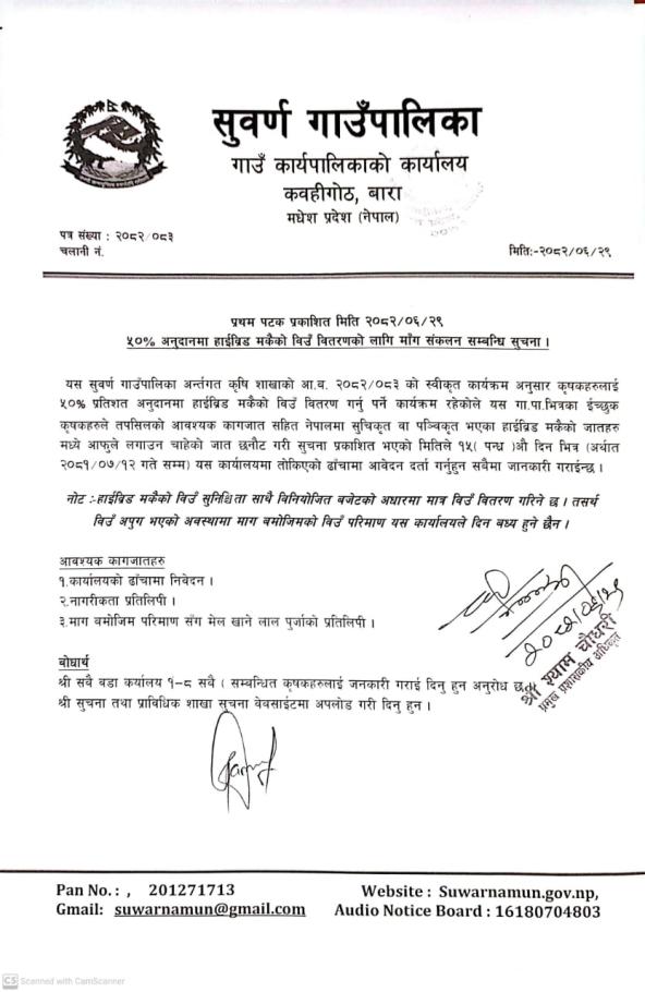 ५० % अनुदानमा हाईव्रिड मकैको विउँ वितरणको लागि मागँ संकलन सम्बन्धी सचना ।