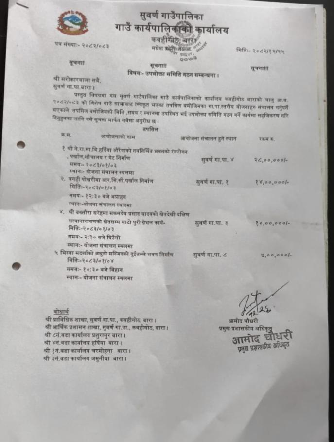सुवर्ण गाउँपालिकाको कार्यालय कवहीगोठ बाराको गाउँ स|भाको १६औ अधिवेशन आज मिति २०८२।१२।२२ गते यस सुवर्ण गाउँपालिकाका अध्यक्ष श्री राजेश प्रसाद यादव ज्यूबाट उद्दघाटन भई निर्णयहरु पारित गरी सम्पन्न भएको केही झलकहरु ।