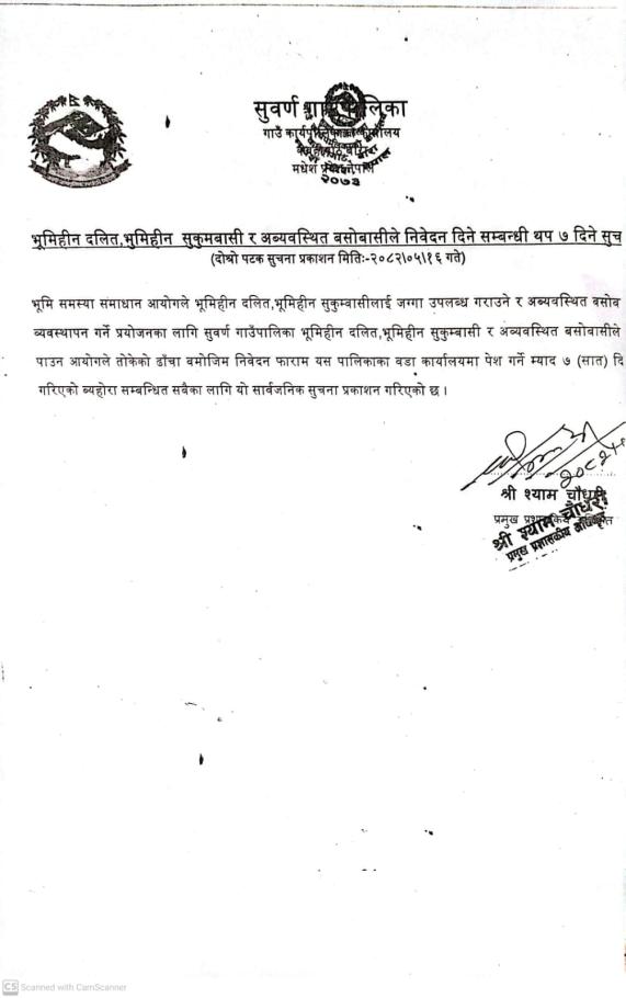सूचना ! सूचना !! सूचना !!! भुमिहिन दलित, भुमिहिन सुकुमबासी र अव्यवस्थित बसोबासीले निवेदन दिने सम्बन्धि थप ७(सत) दिने सूचना ।